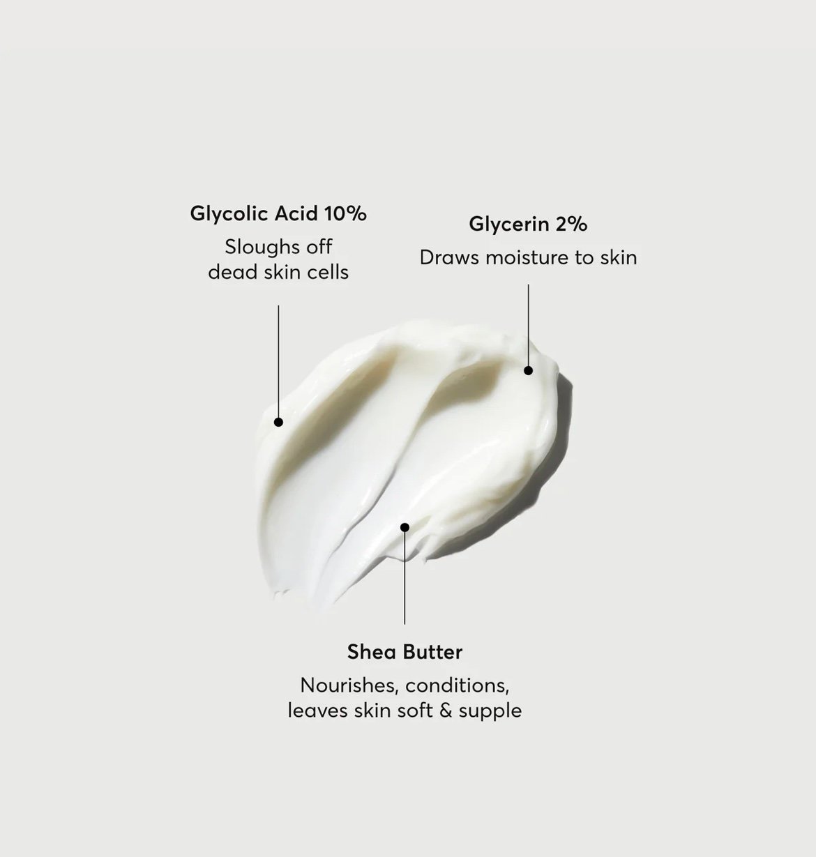 Grâce à sa formule enrichie en acide glycolique 10 % de haute pureté, elle aide à éliminer les cellules mortes, améliorer la texture de la peau et réduire l’apparence des taches brunes. Le beurre de karité nourrissant apporte confort et hydratation durable, idéal pour les zones sèches et rugueuses.