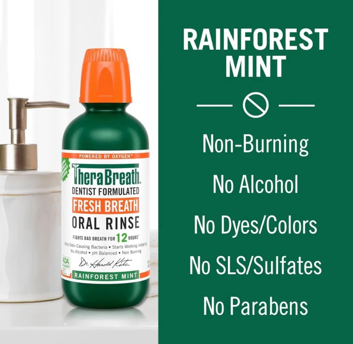 Dites adieu à la mauvaise haleine avec le bain de bouche TheraBreath Fresh Breath Mouthwash au goût Rainforest Mint, formulé avec une menthe naturelle aux notes botaniques rafraîchissantes. Ce bain de bouche sans alcool, qui ne brûle pas, agit immédiatement pour éliminer les bactéries responsables des mauvaises odeurs et combattre la mauvaise haleine pendant jusqu’à 12 heures. Formulé par des dentistes et approuvé par l’ADA, il ne contient ni colorants, ni SLS (sulfates), ni parabènes.